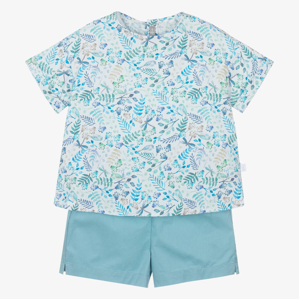 A lovely blue shorts set for girls by luxury brand Il Gufo, made from lightweight cotton poplin. With branded buttons and a bow on the back, the short-sleeved top is beautifully patterned with leaves, dragonflies and birds in varying shades of blue and green. The Italian label's script logo can also be seen within the print. Designed with split hems, the comfortable pull-on shorts have an elasticated waist with a ruffled trim.
