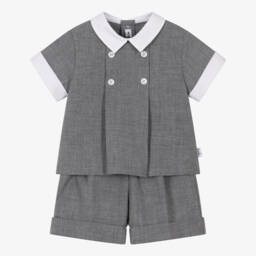 Pretty pale blue cotton shorts set for girls by luxury brand Il Gufo, with an abstract floral print in white. A go-to outfit for warm, sunny days, it is made in lightweight poplin, with frilly, gently-elasticated trims. Easy to wear, it simply pulls on.