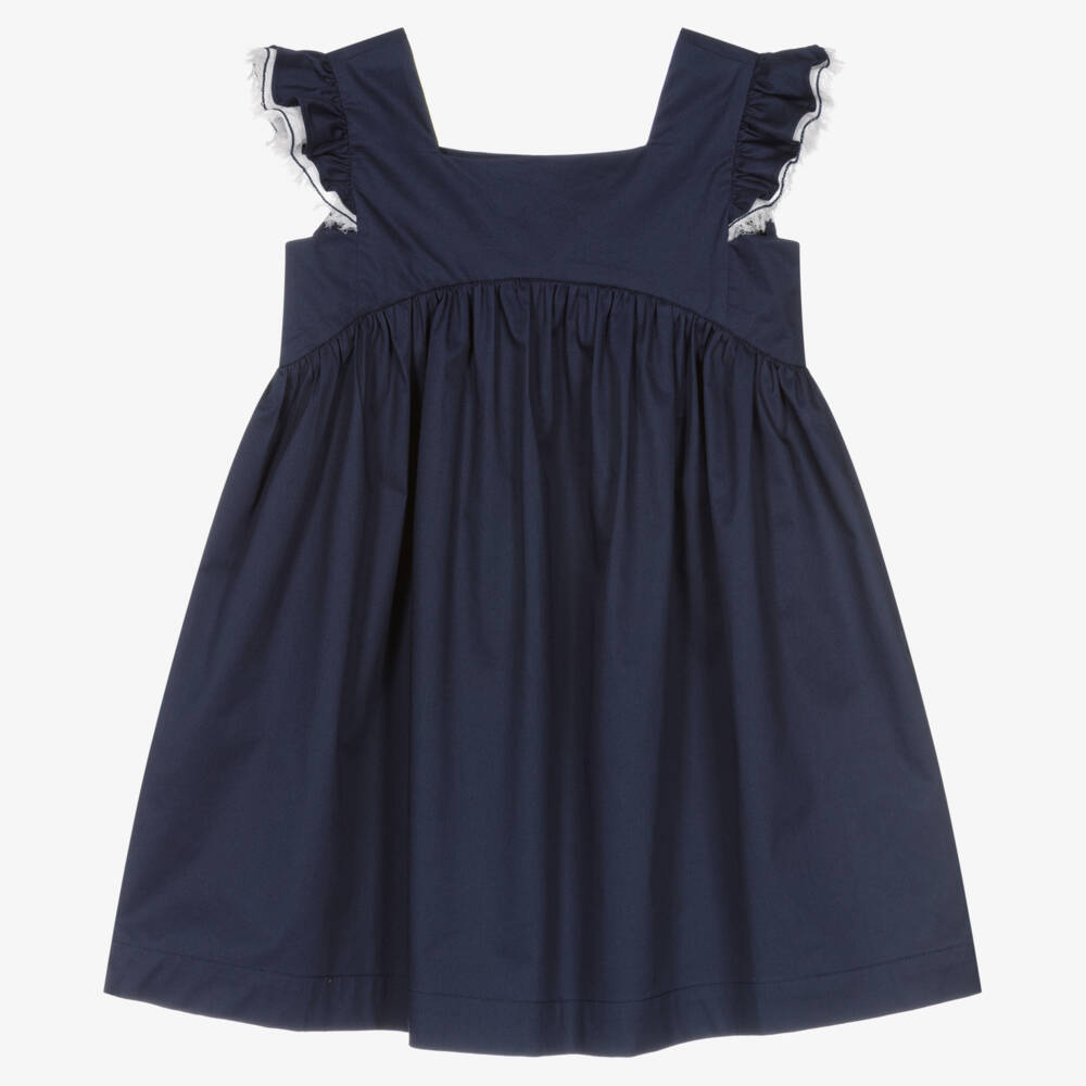 Lovely navy blue cotton dress for girls from luxury designer Il Gufo, crafted in smooth poplin with slight stretch for freer movement. Beautiful features include a stylish curved empire-line waist and square neckline. The capped sleeves are layered with white voile, with navy blue stitching and raw, unfinished edges for a pretty vintage effect. The bodice is lined with cotton for a little extra comfort, and the dress fastens with subtly branded buttons on the back.