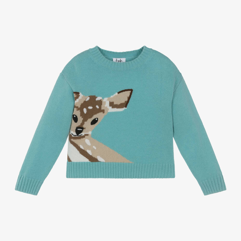 Cute turquoise blue sweater for girls by Il Gufo, the luxury Italian brand. Knitted in soft Merino wool, this cosy layering piece has a sweet intarsia deer motif on the front.