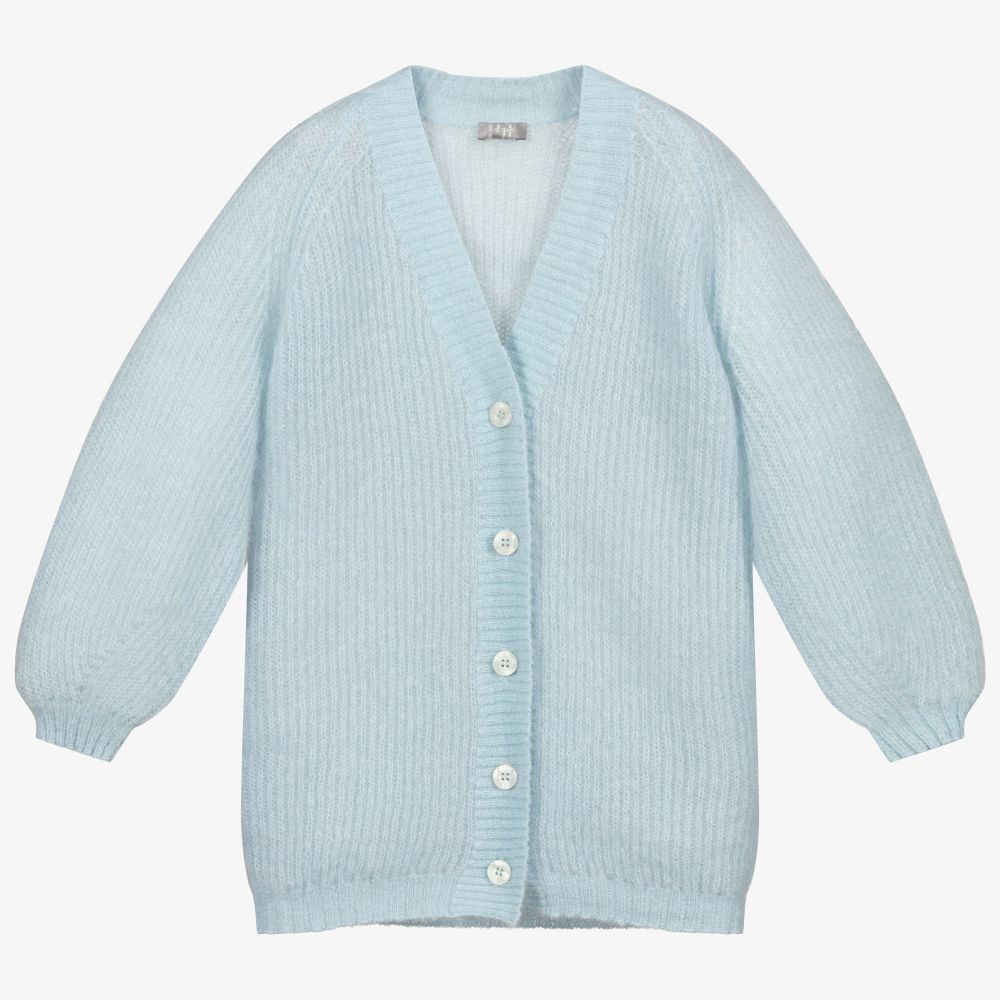 Girls pale blue boyfriend cardigan by Il Gufo, knitted from a luxurious blend of super soft mohair and wool. It has a classic V-neck, ribbed trims and pretty puffed sleeves.