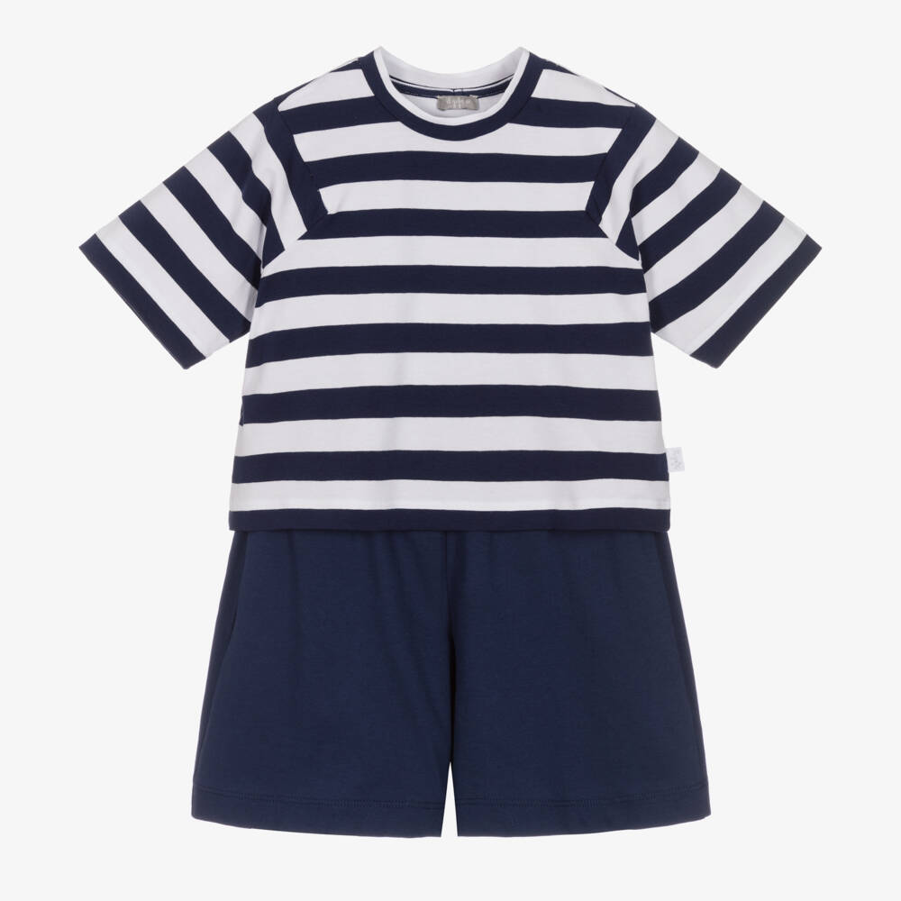 A lovely white and navy blue top and shorts set for girls by luxury Italian brand Il Gufo. Nautically-inspired, the top is patterned in Breton stripes and has a pretty bow on the back. The wide-leg shorts have a gently elasticate waist for easy pull-on. Both pieces are made in soft cotton jersey for all day comfort.