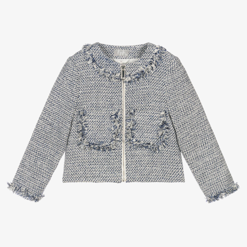 Classically styled navy blue and white jacket for girls by luxury Italian brand Il Gufo, with soft fringing detail. This shorter length design is woven in a soft cotton blend, with a metallic silver thread for a delicate touch of sparkle. Lined in lightweight cotton for comfort, it fastens with an exposed silver zip on the front.