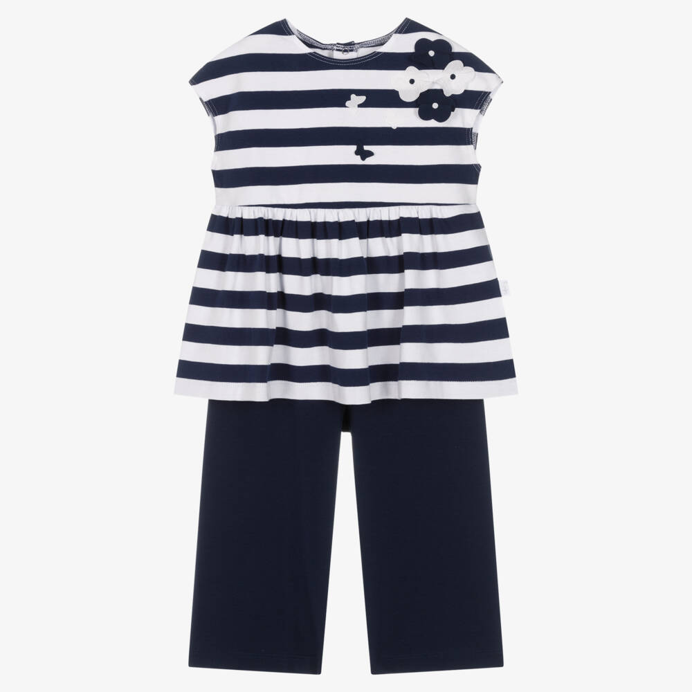 Chic and comfortable for girls, this white and navy blue trouser set from Il Gufo is made in soft cotton jersey. The striped tunic top has pretty floral appliqués on the front, a branded tab on the side seam and popper fastenings on the back. It pairs with cropped wide leg trousers that have an elasticated waist for comfortable wear.