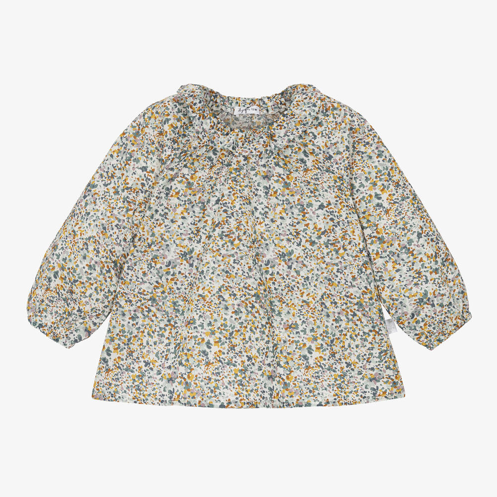A pretty cotton blouse for younger girls by luxury Italian brand Il Gufo, patterned in a beautiful Liberty ditsy floral print in soft shades of green and yellow. The long sleeves have gently elasticated cuffs and the stretchy, ruffle-trimmed neckline allows it to slip on easily over the head. For a subtle designer finish, a small logo tab is sewn on one side seam.