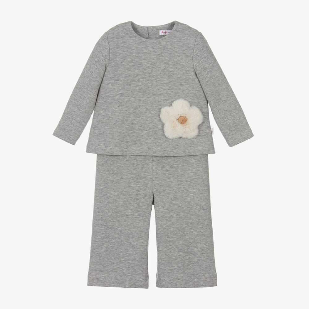 Lovely marl grey trouser set for girls by luxury brand Il Gufo, made in soft cotton blend jersey. The long-sleeved top has a faux fur flower appliqué on the front for a pretty finish and fastens with poppers on the back for easy dressing. The matching wide-leg trousers have an elasticated waist for comfort.