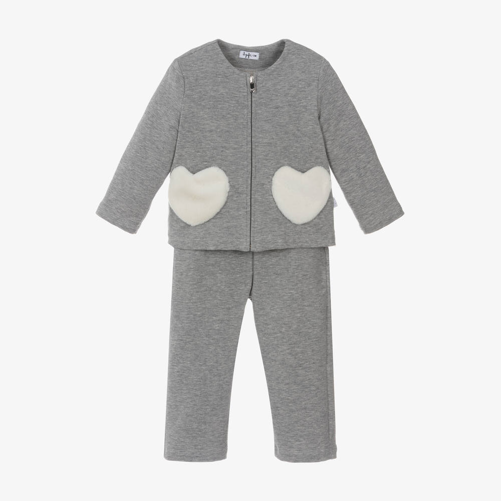 Comfortable grey marl trouser set for girls by luxury Italian brand Il Gufo, made in soft cotton jersey. The zip-fastening top has a rounded neckline and a slightly flared shape. Ivory, heart-shaped faux fur pockets add a cute touch, while the branded zip-pull and embroidered tab give a discreet branded finish. The matching trousers have a gently elasticated waistband.
