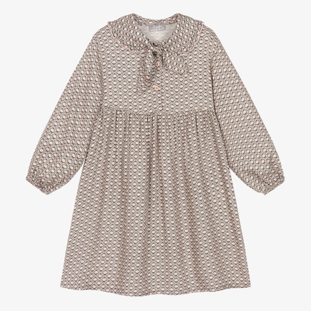 Slate grey and pale pink dress for girls by Italian label Il Gufo. Patterned with a vintage-style floral print, it is made in silky-soft viscose twill, offering an elegant drape. This nostalgic dress has an oversized bow collar, dainty pink front button fastenings, and softly elasticated cuffs for shape.