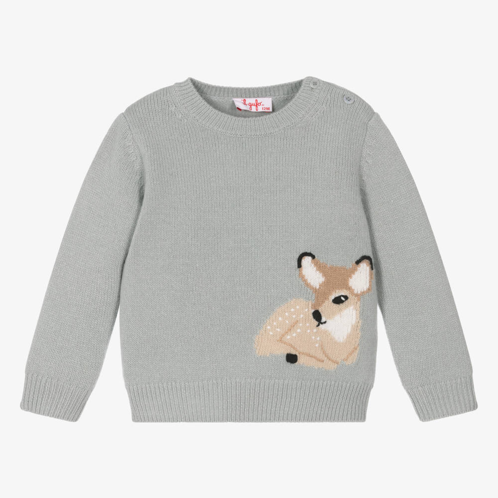 A lovely grey sweater for little girls by Italian brand Il Gufo, with an adorable deer motif on the front. Luxuriously soft, it is made in pure virgin wool and has cosy ribbed trims. There are shoulder button fastenings on the smaller sizes to help with dressing.