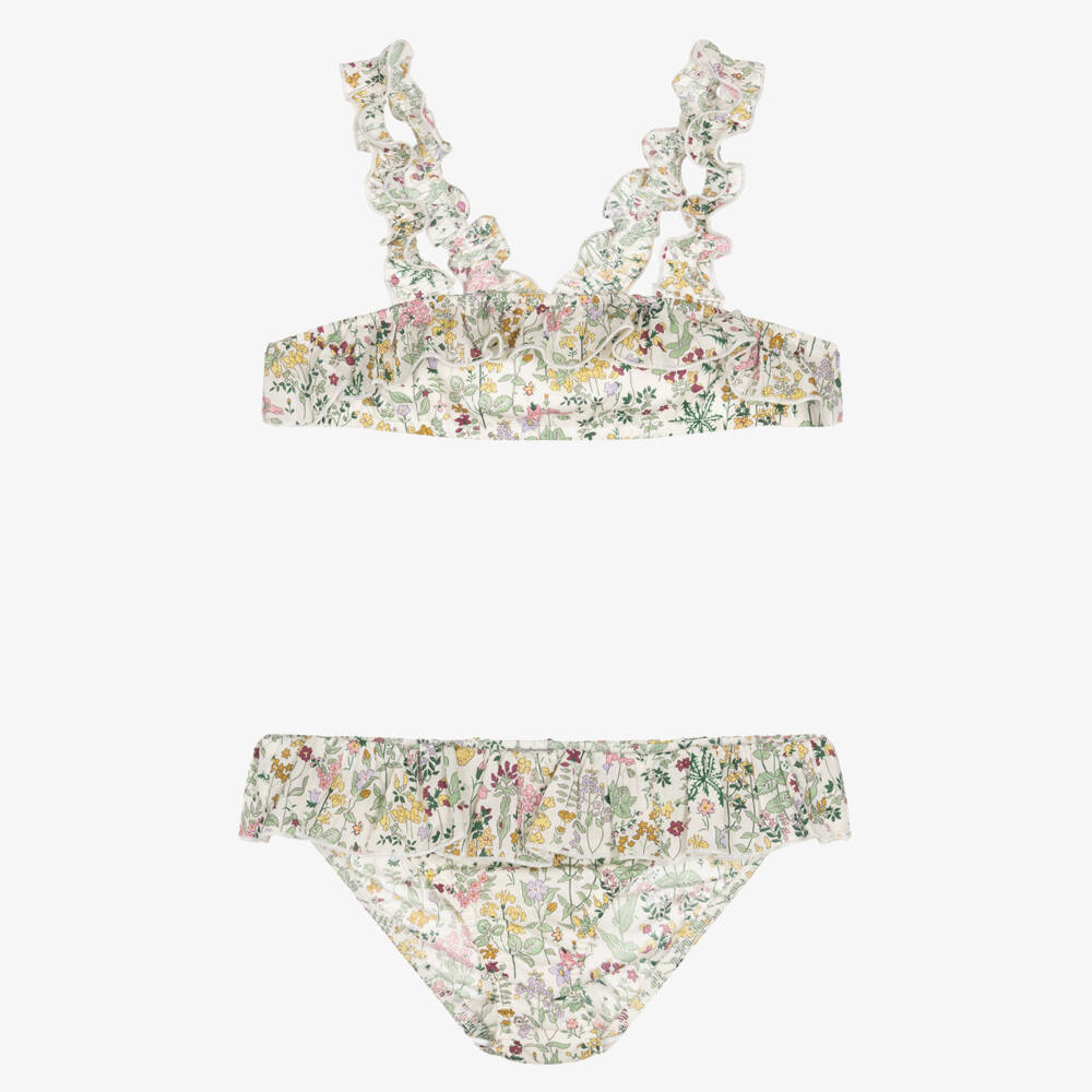 Pretty ivory beach set for girls from luxury brand Il Gufo, made in soft Tana Lawn™ cotton poplin. Printed with a stunning Liberty floral print, it is ideal for relaxing around on the beach. The straps are lightly elasticated with delicate ruffles and both pieces are finished with frills for a feminine finish.