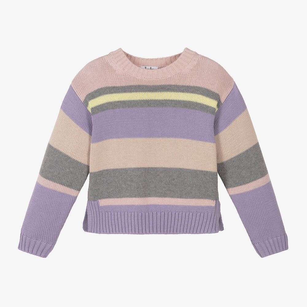 Casual, stripy, long-sleeved sweater for girls by luxury Italian brand Il Gufo. Soft and comfortable, it is knitted in lilac purple, pink, beige and grey cotton, and is highlighted in yellow. It has neat, ribbed trims and is vented on the side seams.