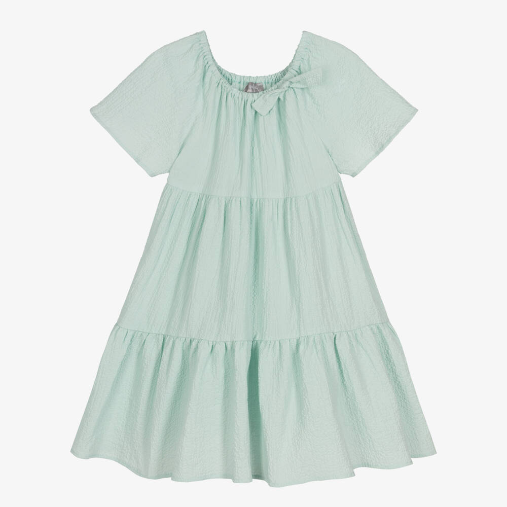 Pretty mint green dress for girls by luxury brand Il Gufo, woven in beautifully lightweight cotton seersucker. This tiered style has wide flutter sleeves for an elegant look. The fixed tie bow is embroidered on the elasticated neckline for a girly finishing touch.