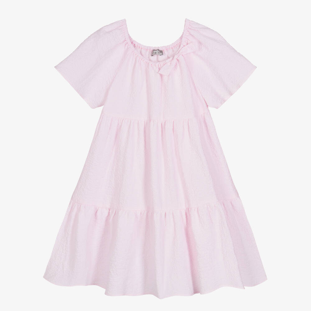 Pretty pastel pink dress for girls by luxury brand Il Gufo, woven in beautifully lightweight cotton seersucker. This tiered style has wide flutter sleeves for an elegant look. The fixed tie bow is embroidered on the elasticated neckline for a girly finishing touch.