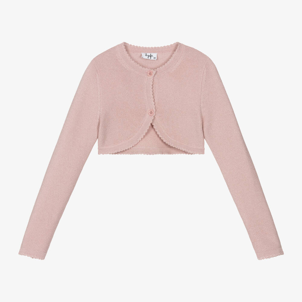 Sweet pink cotton cardigan for girls by luxury Italian label Il Gufo. Ideal for elevating an outfit, it is bolero-style and sparkles with gold thread in the weave. With long sleeves and scalloped, ribbed trims, it fastens with logo buttons on the front for subtle branding.