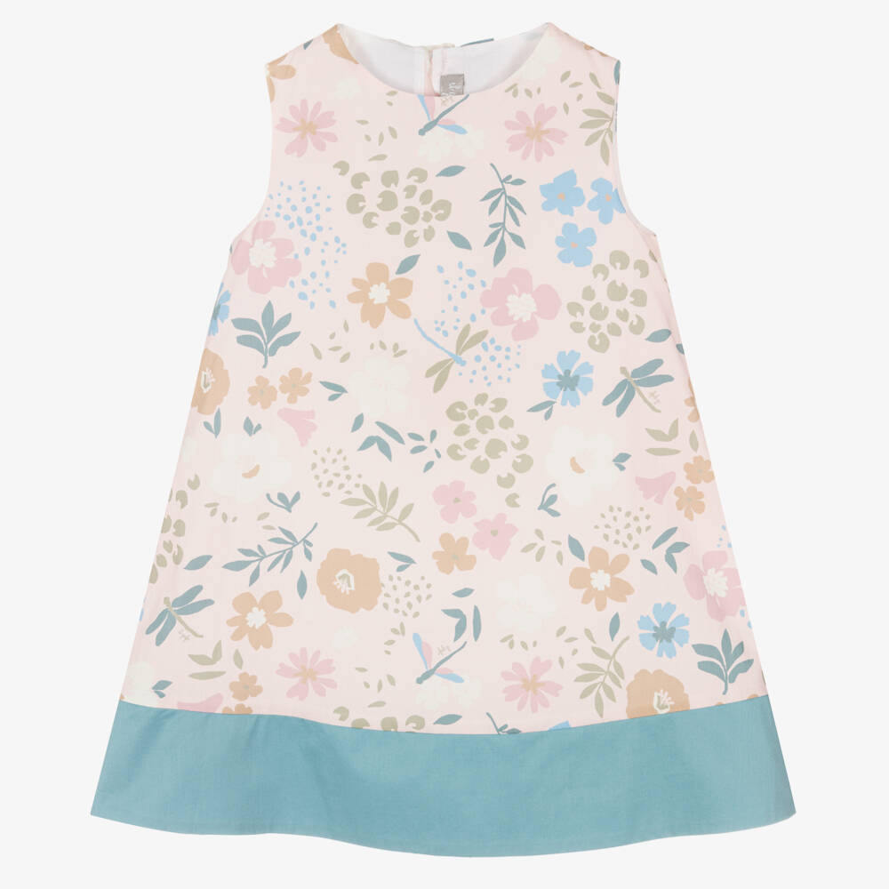 A lovely light pink dress for girls by luxury Italian designer Il Gufo, made from lightweight cotton poplin with a soft voile lining. Channelling the brand's romantic aesthetic, this sleeveless design is patterned in pretty blue, white and beige flowers with a solid blue hemline. The designer's script logo can also be seen within the print. The branded button fastenings on the back are neatly covered with a blue bow for a charming finish.