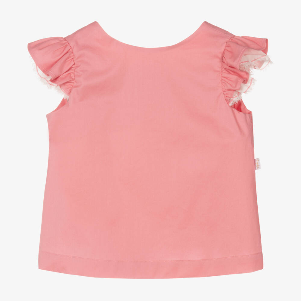 Girls pink cotton poplin blouse from luxury designer Il Gufo. This lovely top is characterised by layered poplin and voile capped sleeves, with stitch details and raw, unfinished edges for a pretty vintage effect. The Italian label's logo tab is stitched on the side seam for a subtle designer look. Soft and lightweight, it has an elasticated panel and pleat detail on the back for quick and easy dressing.