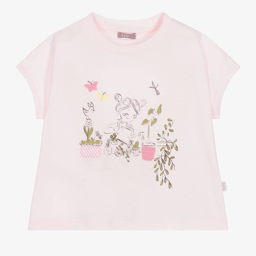 Cute pink T-shirt for girls by luxury brand Il Gufo, made in soft cotton jersey. The front is printed with a sweet gardening girl on the front, with embroidered plant pot and watering can details. In a relaxed, boxy style, this everyday tee has a white and gold logo tab embroidered on the side seam for a discreet branded finish.