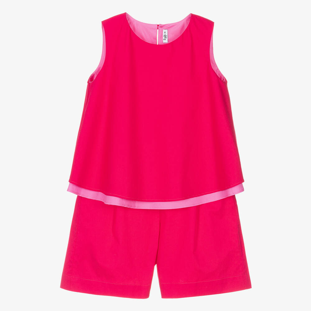 Bright pink shorts set for girls by luxury brand Il Gufo, made in lightweight cotton poplin. Fastening with buttons on the back, the sleeveless top has a round neckline and a contrast pink lining which can be seen below the hem. The matching shorts are designed with gentle inverted pleats on the front for a relaxed silhouette. They have an adjustable waistband to allow room for growth.