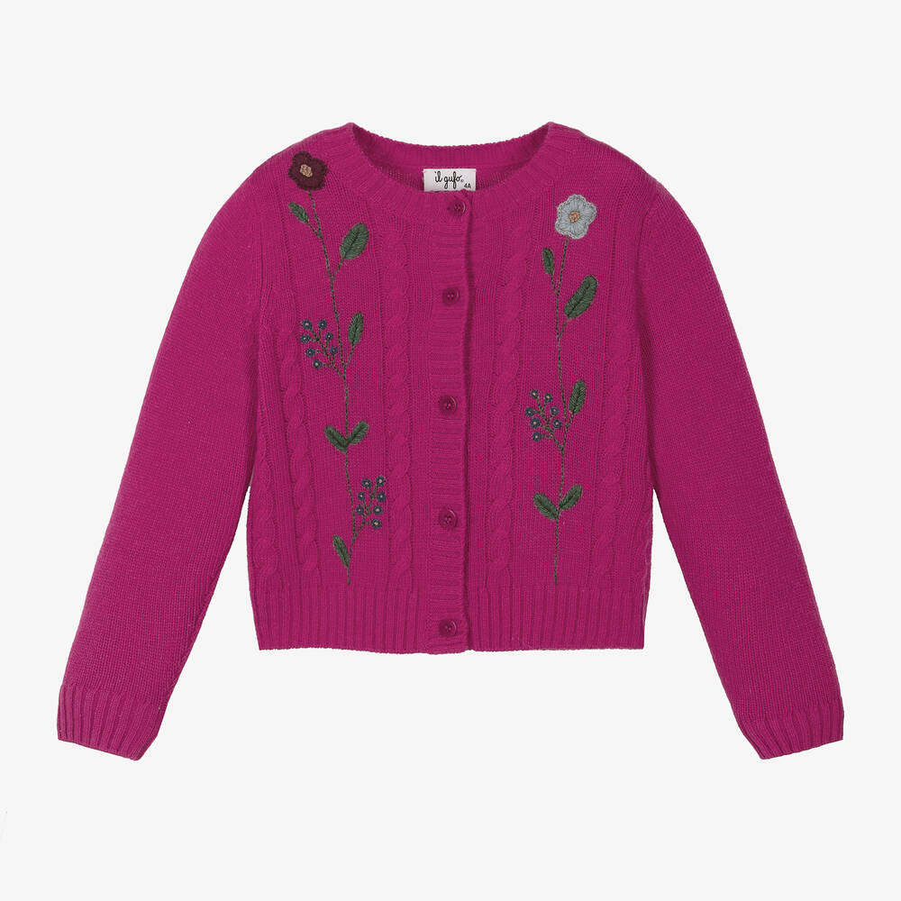 Lovely deep pink cardigan for girls by luxury Italian brand Il Gufo, beautifully embroidered with flowers on the front. Knitted with a traditional cable pattern in soft, warm wool, it has long sleeves, cosy, ribbed trims and branded button fastenings.