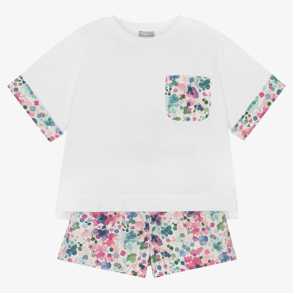 A delightful white and pink shorts set for girls, by luxury Italian brand Il Gufo. Made in the softest cotton jersey, the classic crew neck T-shirt has a contrasting front pocket and turn-over sleeves. The matching shorts are printed in a gorgeous floral design, and have a stylish elasticated paperbag waist.