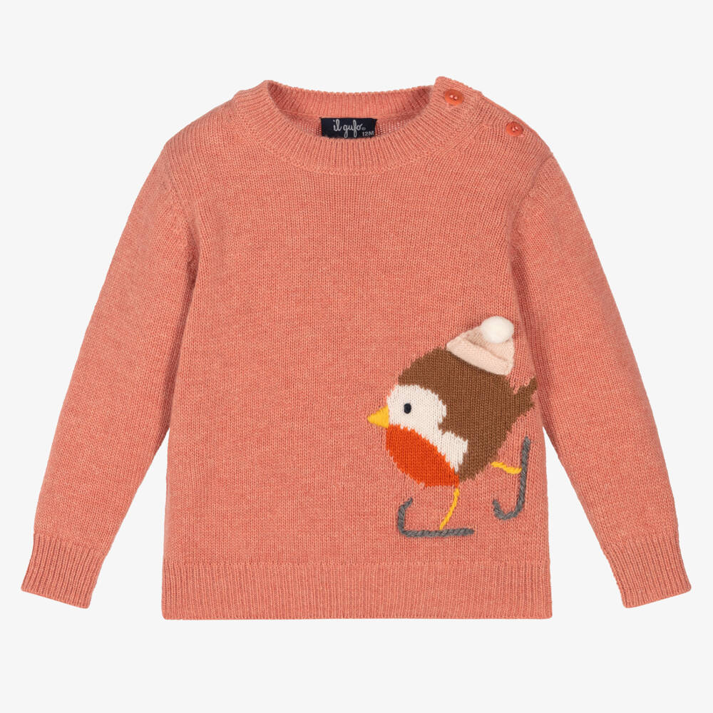 Girls gorgeous pink sweater by luxury Italian brand, Il Gufo. Knitted from the finest Merino wool yarn, which is ethically sourced and environmentally friendly, this warm and cosy jumper has a cute festive robin motif on the front, with buttons on one shoulder for easy dressing