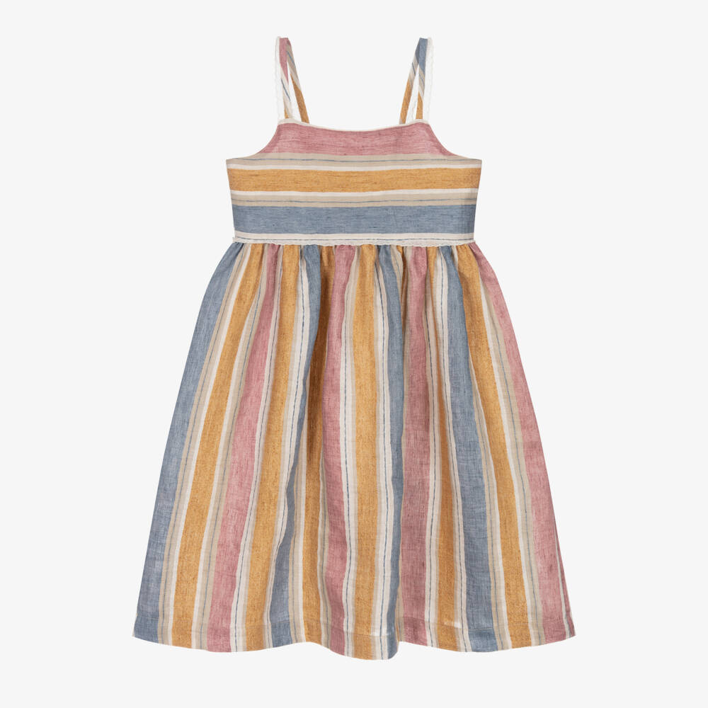 In a pink, gold and blue stripe, this lovely dress for girls is by luxury Italian brand Il Gufo. It is made in a lightweight linen blend and partly lined in soft cotton for comfort. It has delicate lace trims and fastens with buttons on the back.