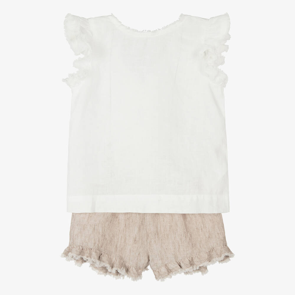 Girls White & Beige Linen Shorts Set