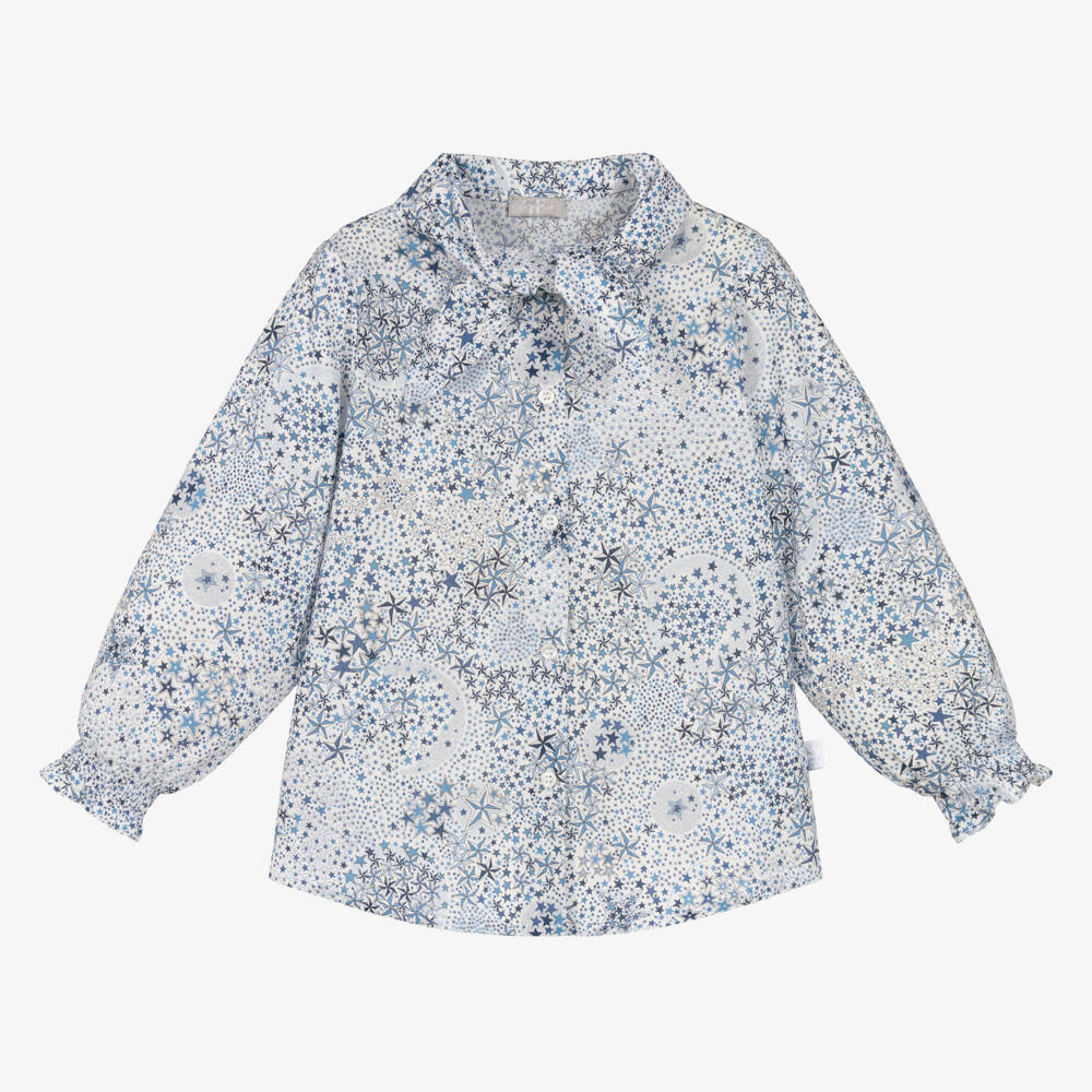 A white and blue cotton blouse for girls by Il Gufo. The Italian brand has designed this luxuriously soft and lightweight poplin blouse with a pretty Liberty star print, softly elasticated cuffs and an elegant bow neckline. It fastens with shimmering front buttons for a classic look.