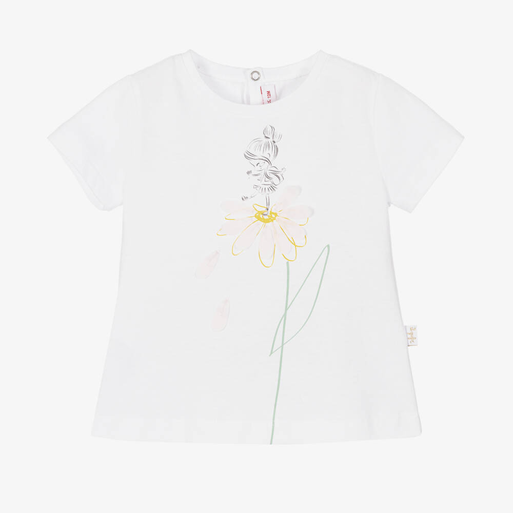 White T-shirt for little girls by luxury Italian brand Il Gufo, with a sweet girl and pink flower motif on the front. Made in soft and comfortable cotton jersey, it has popper fastenings on one shoulder to help with dressing. A branded tab on the side seam adds a subtle designer touch.