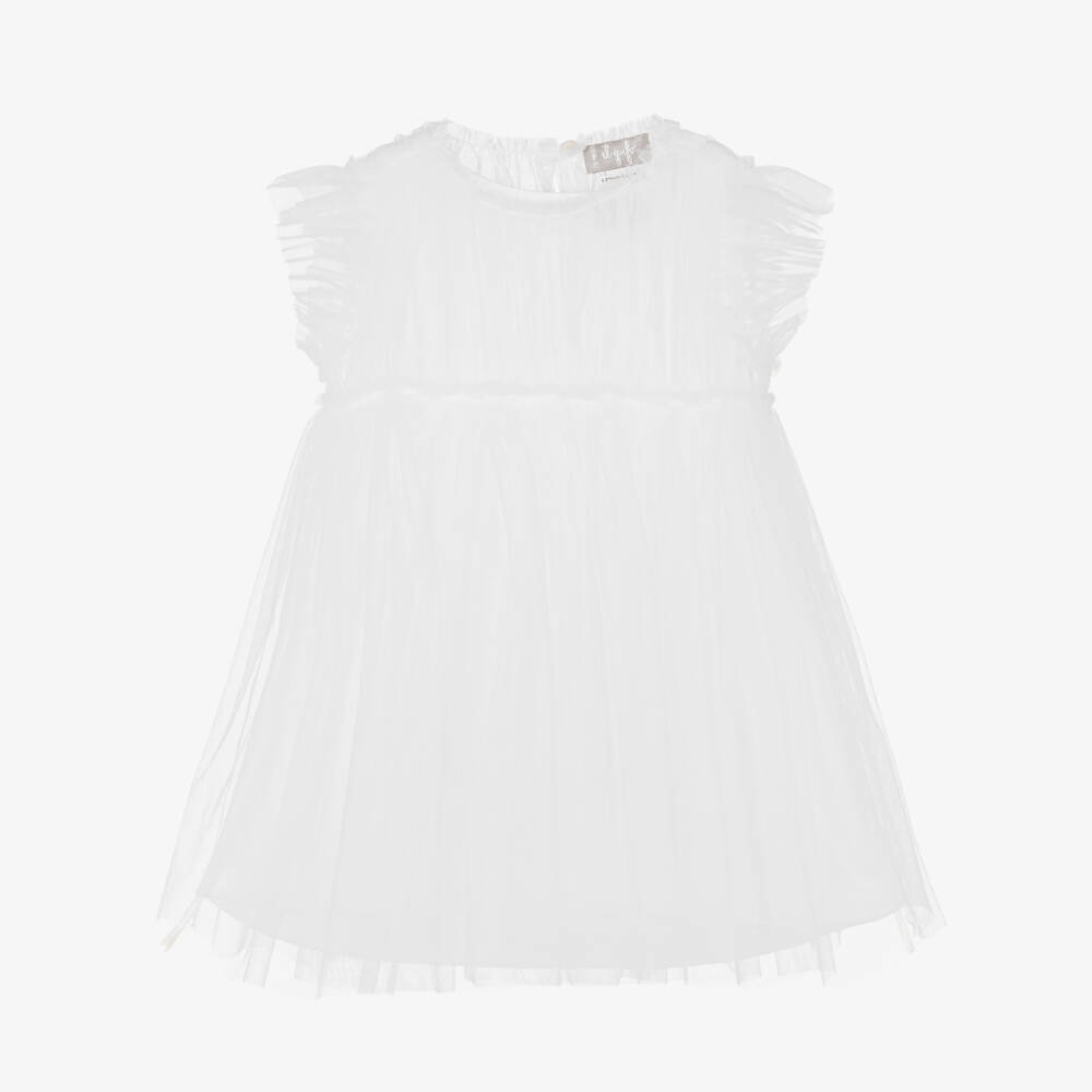 Lovely for a special occasion, this white dress for girls is by luxury Italian brand Il Gufo. Simple yet elegant, it is made in sheer tulle and has a soft cotton jersey lining that is removable. This beautiful dress fastens with buttons on the back, and its comfortable lining has easy-fastening poppers.