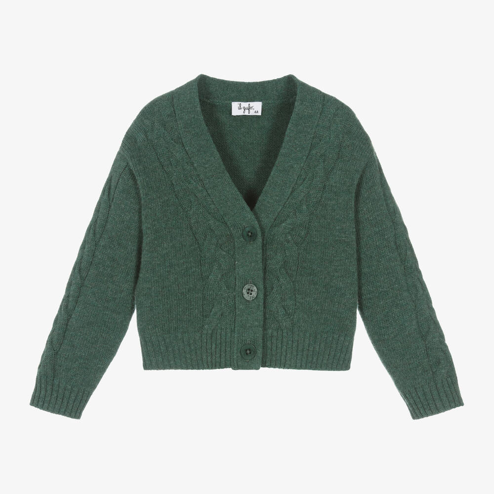 Dark green cardigan for boys and girls by luxury Italian brand Il Gufo, knitted in wonderfully soft virgin wool. An ideal layering piece, this classic style has cable knit detailing and cosy ribbed trims. It fastens on the front with branded buttons for a discreet designer detail..
