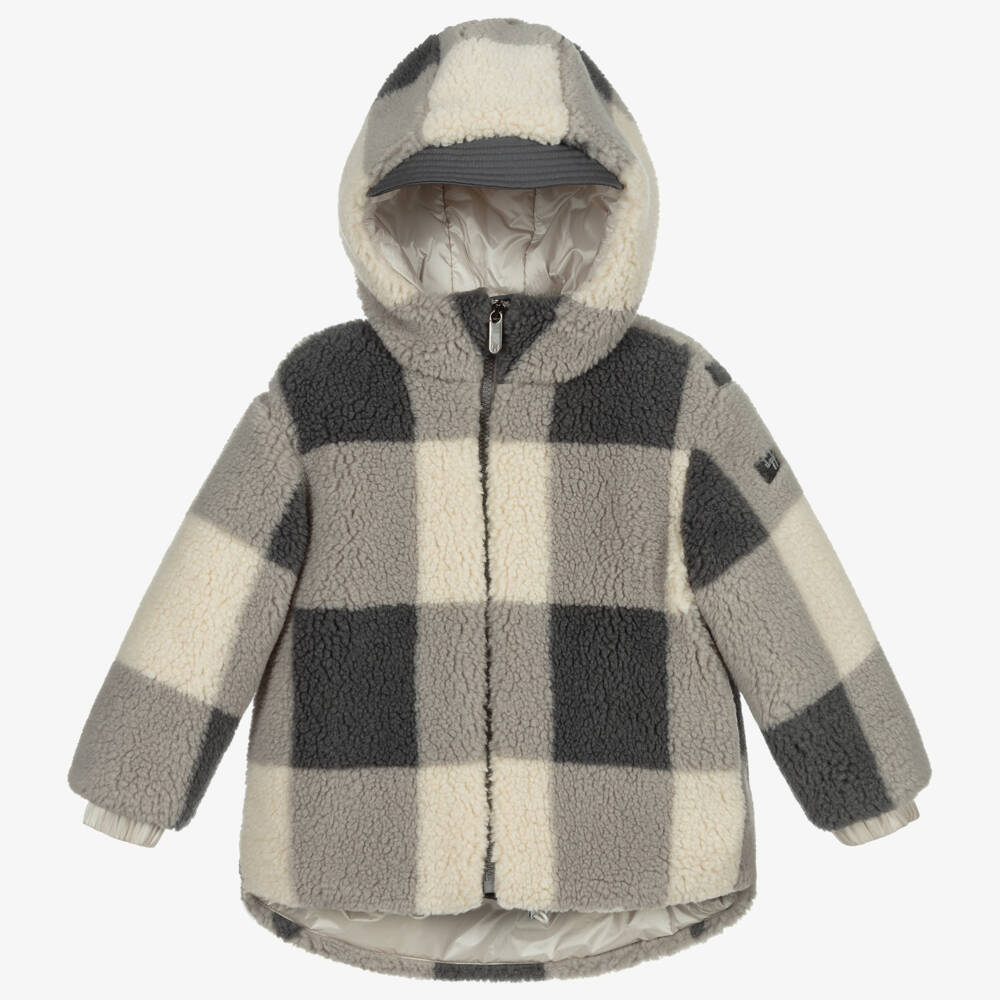 Grey and beige check teddy coat for boys by luxury Italian brand, Il Gufo. Lined with soft and silky polyamide, it has ribbed cuffs and toggles at the hem to tighten to keep warm, and a grey rubber logo badge on one sleeve.