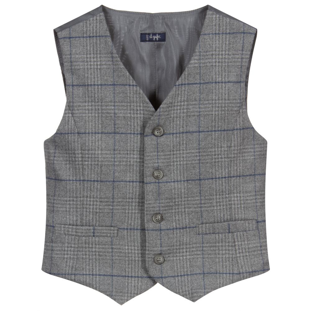 Grey check waistcoat for boys by Il Gufo, made in a super soft, mid-weight fabric with a silky, lightweight lining and back. It has a grey and navy blue check pattern and two faux pockets.