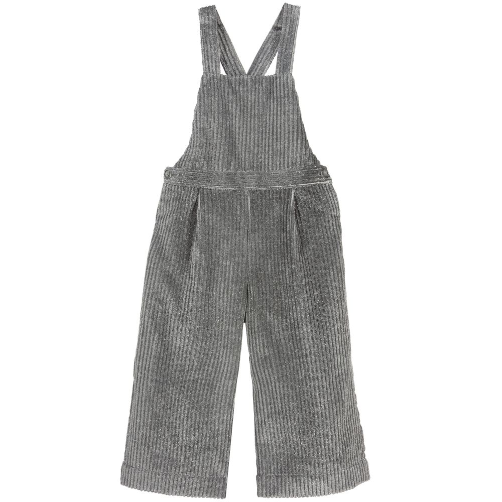 Grey wide-leg dungarees for girls by Il Gufo, made in soft jumbo cord, with glittery silver threads. They fasten with buttons at the side and have adjustable, button fastening shoulder straps.