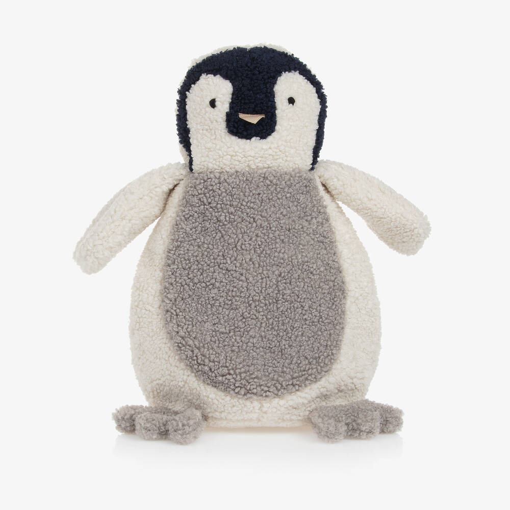 An adorable ivory and grey teddy fleece backpack for boys and girls by luxury brand Il Gufo, in the shape of a penguin. He has a lightly padded head with navy blue detailing and a cute appliqué beak and eyes. Fastening with a zip, the spacious main compartment has a silky lining and is ideal for small essentials. Complete with grey adjustable straps, it has a matching top handle that can be easily hung on a hook.