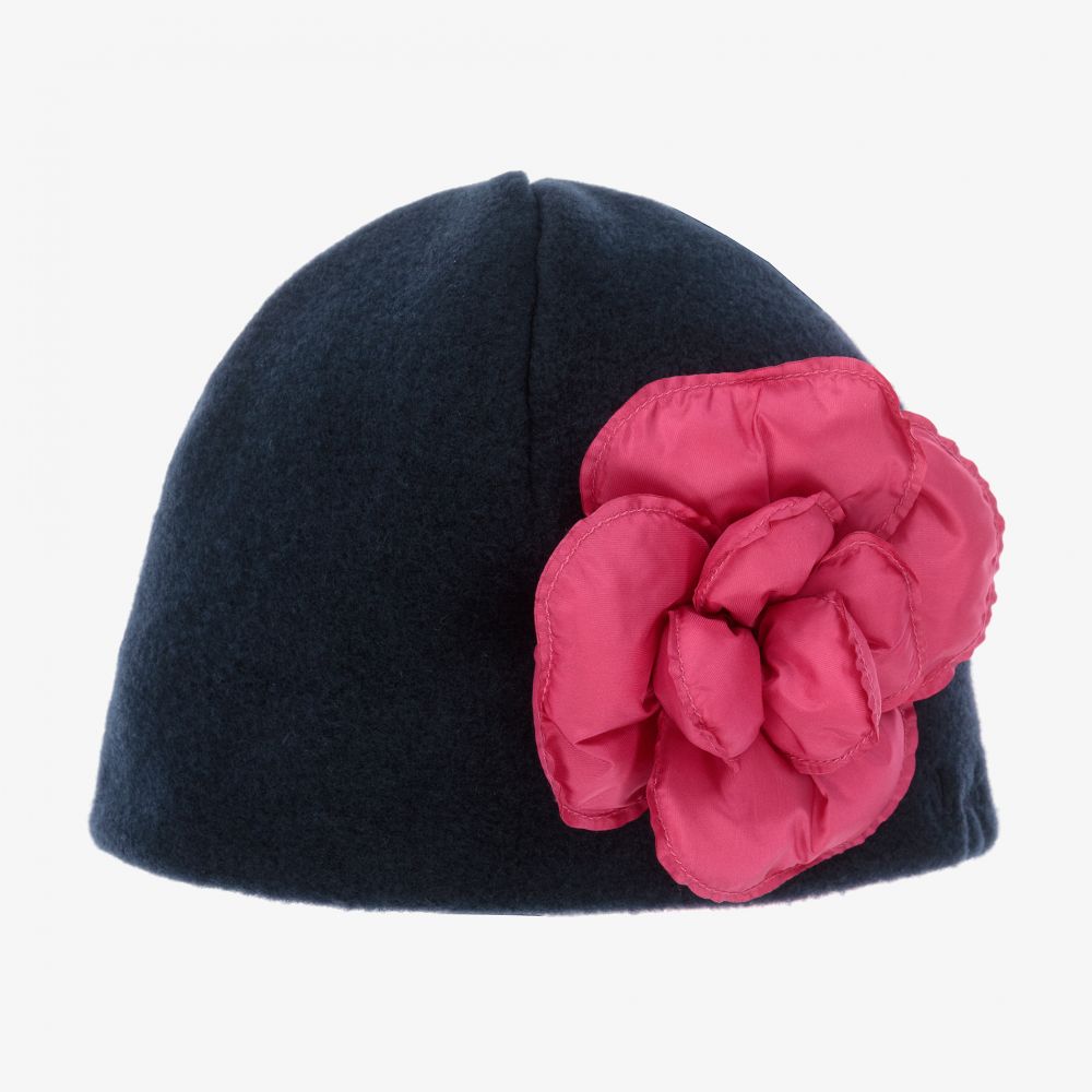 Girls navy blue polyester fleece beanie hat by Italian luxury brand Il Gufo, with a shiny padded fuchsia pink nylon flower appliqué on the side and a navy blue embroidered logo on the front.