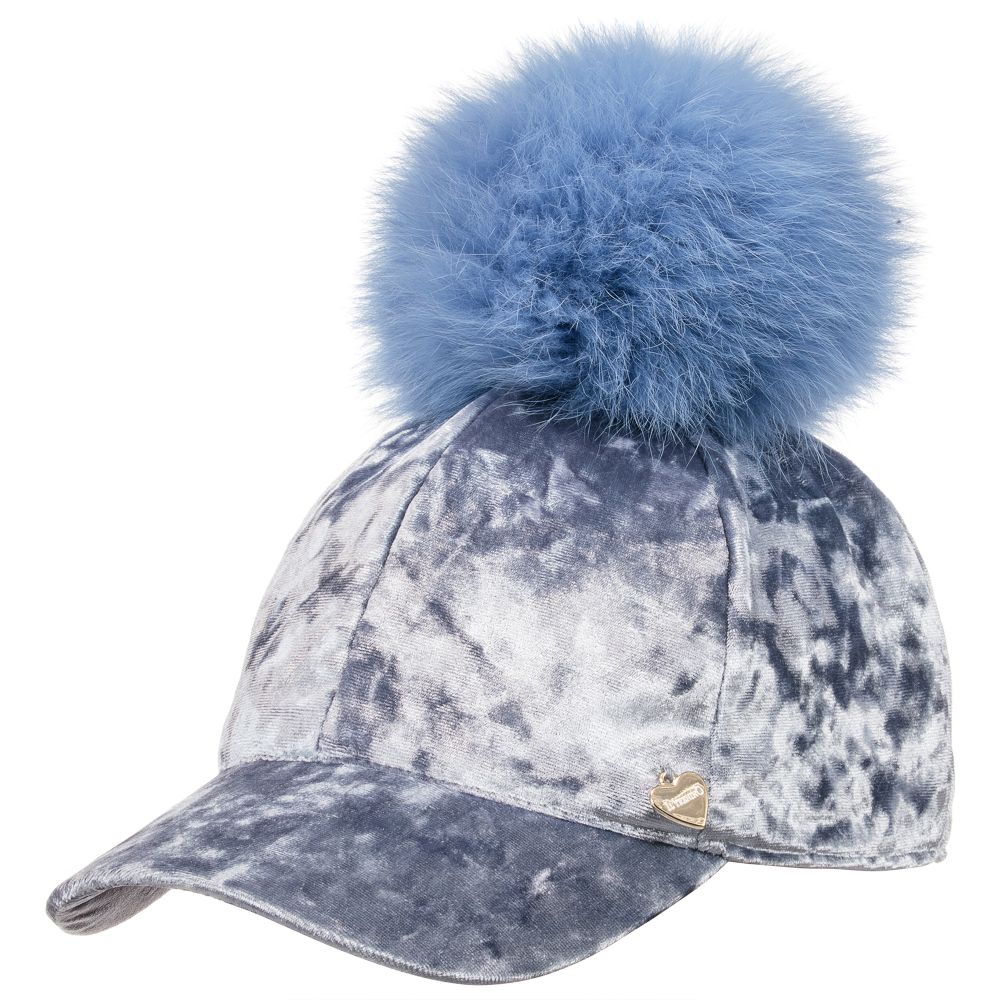 A pretty blue hat for girls with large fur pom-pom by Il Trenino. This soft, crushed velvet hat is crafted in Italy and has a soft polar fleece lining for added comfort and warmth. There is a branded heart charm on the front and the hat can be adjusted with a Velcro strap on the back.