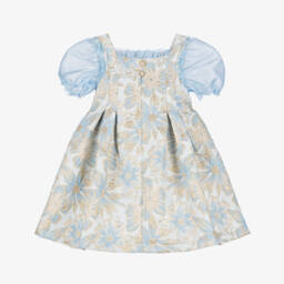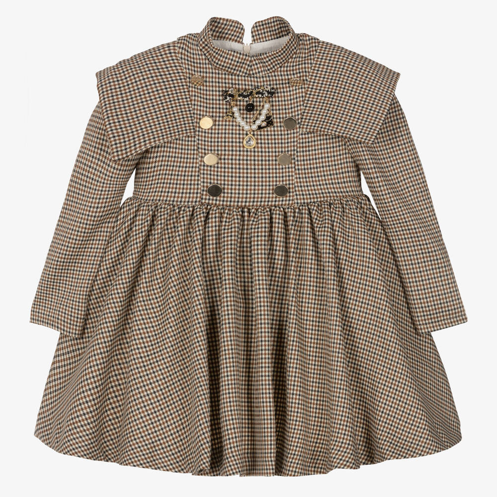 A lovely brown and ivory checked dress for girls by Spanish brand Irpa, made from soft woven fabric. Great for smarter occasions, it has a standing collar and panels on the shoulders. There are decorative, mirrored buttons on the chest, along with a pretty pearl and charm brooch in the centre. It has a lightweight lining for comfort, with a tulle trim on the hem for a voluminous look.