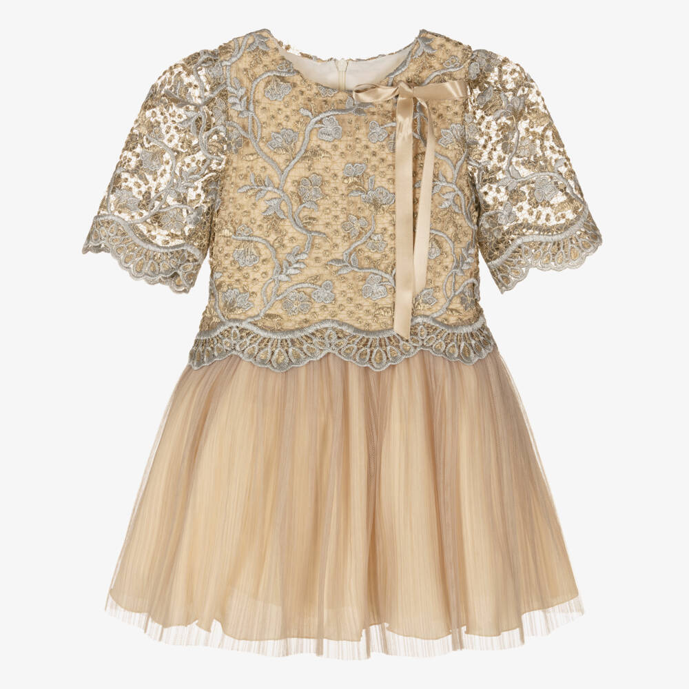 Girls gold and beige special occasion dress by Irpa, featuring a fitted, brocade bodice. It has stunning gold and metallic silver floral embroidered on the bodice, with sheer puffed sleeves for an elegant look. The beige skirt is crafted in the finest tulle, offering floaty fashion to this pretty style. Lined in a soft cotton blend for comfort during smart occasions, it fastens with a concealed zip on the back for a flawless finish.