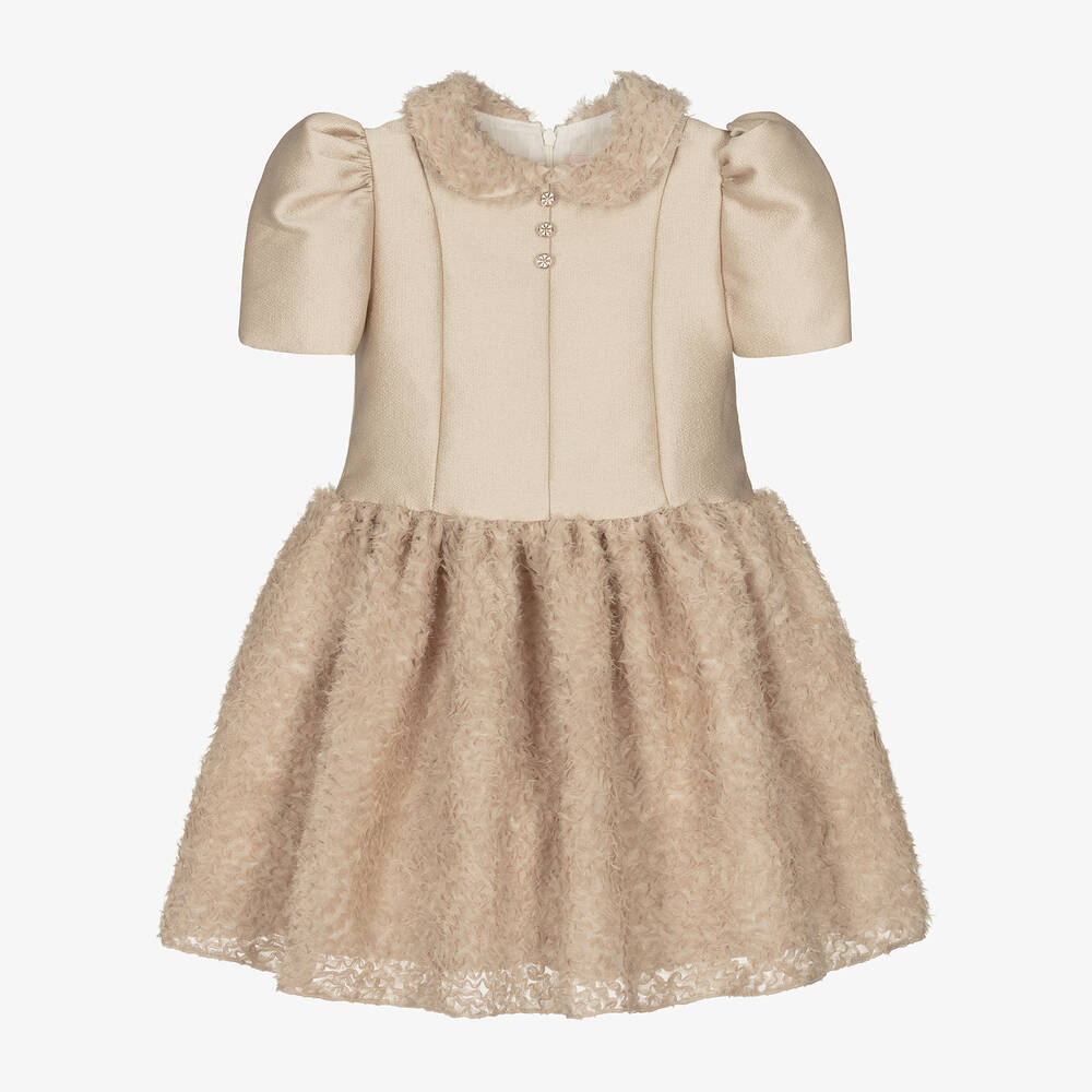 Eye-catching gold special occasion dress for girls by luxury Spanish brand Irpa. The shimmering, slightly textured bodice is panelled, with decorative white and gold buttons on the front and puffed sleeves. The collar has an overlay of tulle embellished with frayed, swirling, silky appliqués. The matching skirt is full and gathered, and is given even more volume by the mesh frill on the soft voile lining. The dress fastens with a neat, concealed zip on the back.