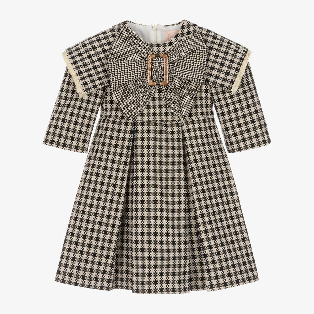 Stylish and eye-catching, black and ivory dress for girls by Irpa, woven in houndstooth check jacquard with a sparkly gold thread. Ideal for smart occasions, it has shoulder panels with fringing trim and a dramatic bow detail in a contrasting fine check, with an iridescent, golden buckle centre. This short-sleeved style has a box pleat skirt and is fully lined in a comfortable cotton blend, with tulle trim creating extra volume. It fastens discreetly with a concealed zip on the back.