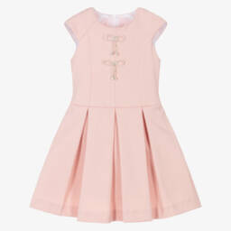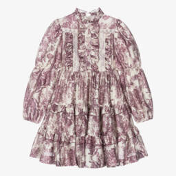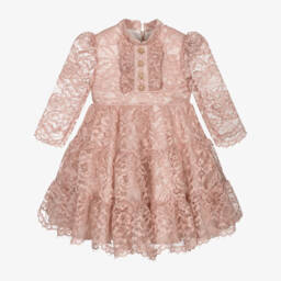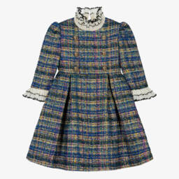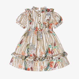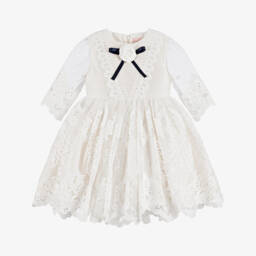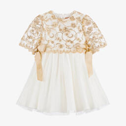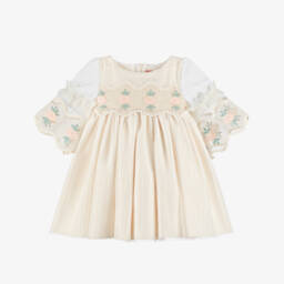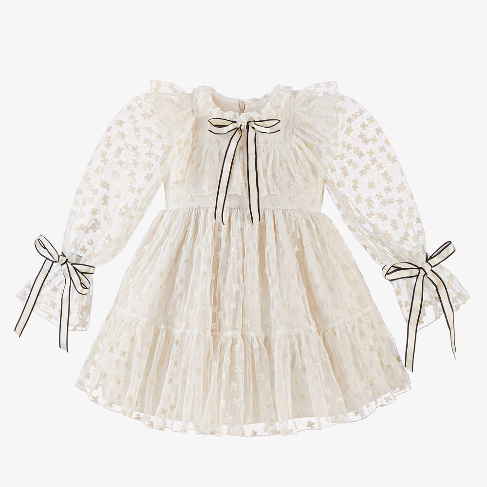 Elaborate ivory tulle dress for girls by Spanish brand Irpa, covered with embroidered daisies. Ideal for a special occasion, it has a ruffled collar, with deep frills around the bodice and hemline of the full, gathered skirt. Beautiful, black-edged, satin bows sit on the front and the cuffs of the long, puffed sleeves. Below the tulle is a layer of satin twill, lined with comfortable voile and trimmed in mesh to add volume to the skirt. The dress fastens with a discreet, concealed zip around the back.