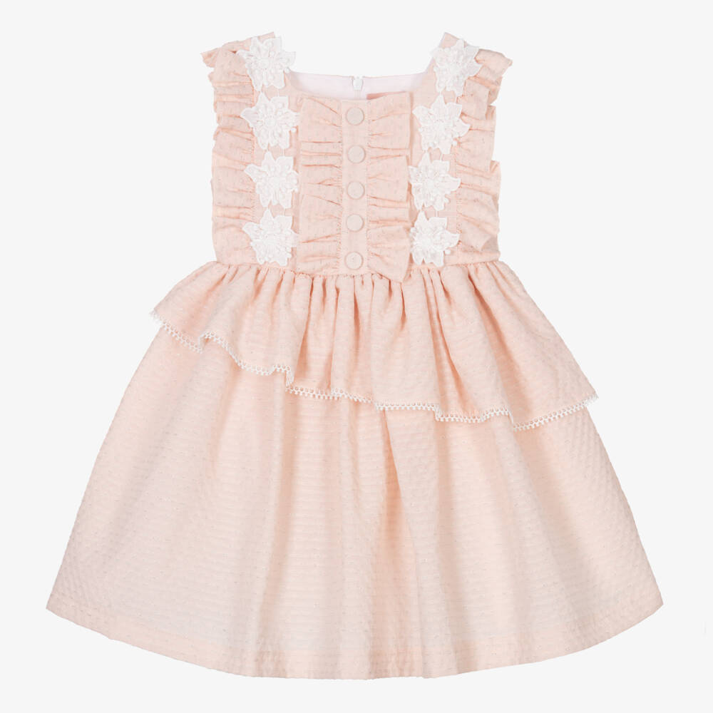 Gorgeous blush pink dress for girls by Irpa, sparkling in the light with glittery silver thread. This stunning dress is softly woven in cotton, viscose and linen. The fitted bodice has a ruffle trim, decorative buttons and embroidered flower appliqués. It flows beautifully into the voluminous skirt, which is trimmed with delicate ivory cutwork. Fastening with a concealed zip on the back, it is lined in comfortable cotton-blend material for comfort against the skin.