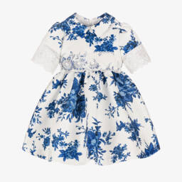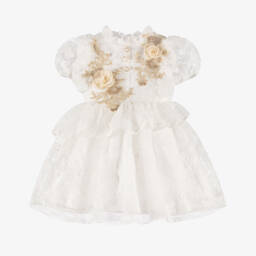 Delightfully pretty, this special occasion dress for girls by Irpa is in a lovely muted pink shade. Made from a gorgeous floral lace with a smooth satin underlayer, it has pretty frills on the high neckline and around the armholes. There are beautiful white and pink embroidered appliqué flower trims on the bodice, as well as gold button embellishments with faux pearl and sparkly diamanté detailing. Lined in soft cotton, this fit and flare sleeveless dress fastens with a concealed zip on the back for a neat finish.