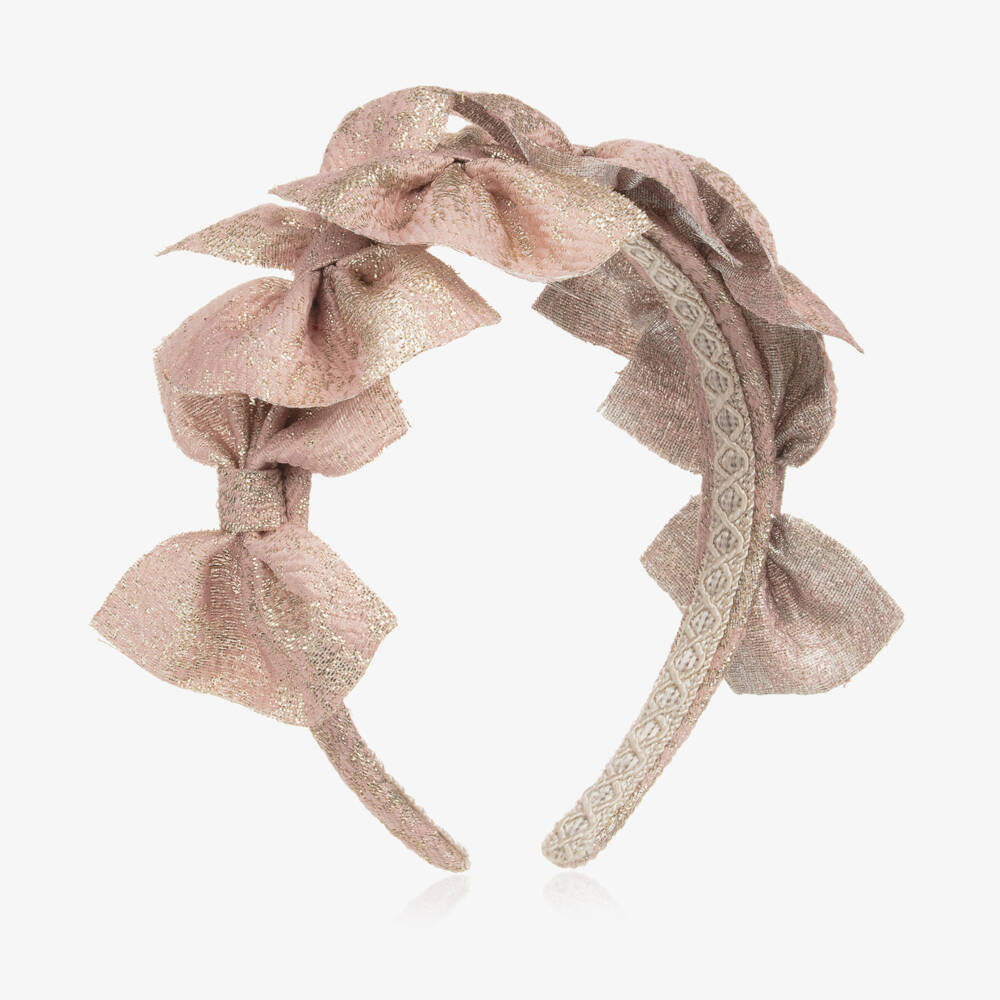 A pink and gold hairband for girls from Spanish brand Irpa, stunning for special occasions. It is decorated with a row of gorgeous bows made in a soft jacquard fabric with a subtle shimmer. The fabric-covered, flexible band has a braided trim on the inside to help it stay in place.