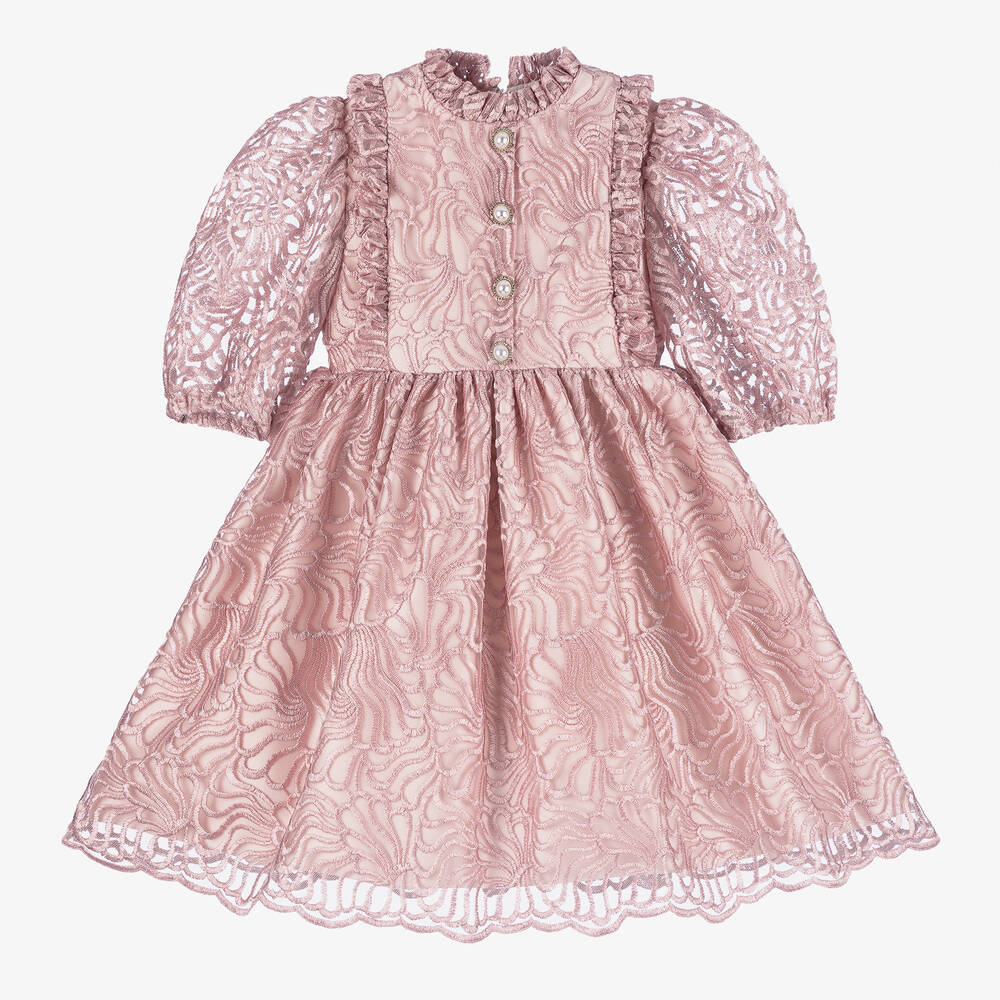 Gorgeous pink special occasion dress for girls by Irpa, made from fine tulle with an embroidered wavy pattern and a silky satin underlayer. The ruffle-trimmed bodice is decorated with faux pearl and diamanté buttons and the sheer puffed sleeves have comfortable, elasticated cuffs. Lined in a lightweight cotton blend with tulle trim for added volume, the dress has a sweetly scalloped hemline and fastens neatly with a concealed zip on the back.