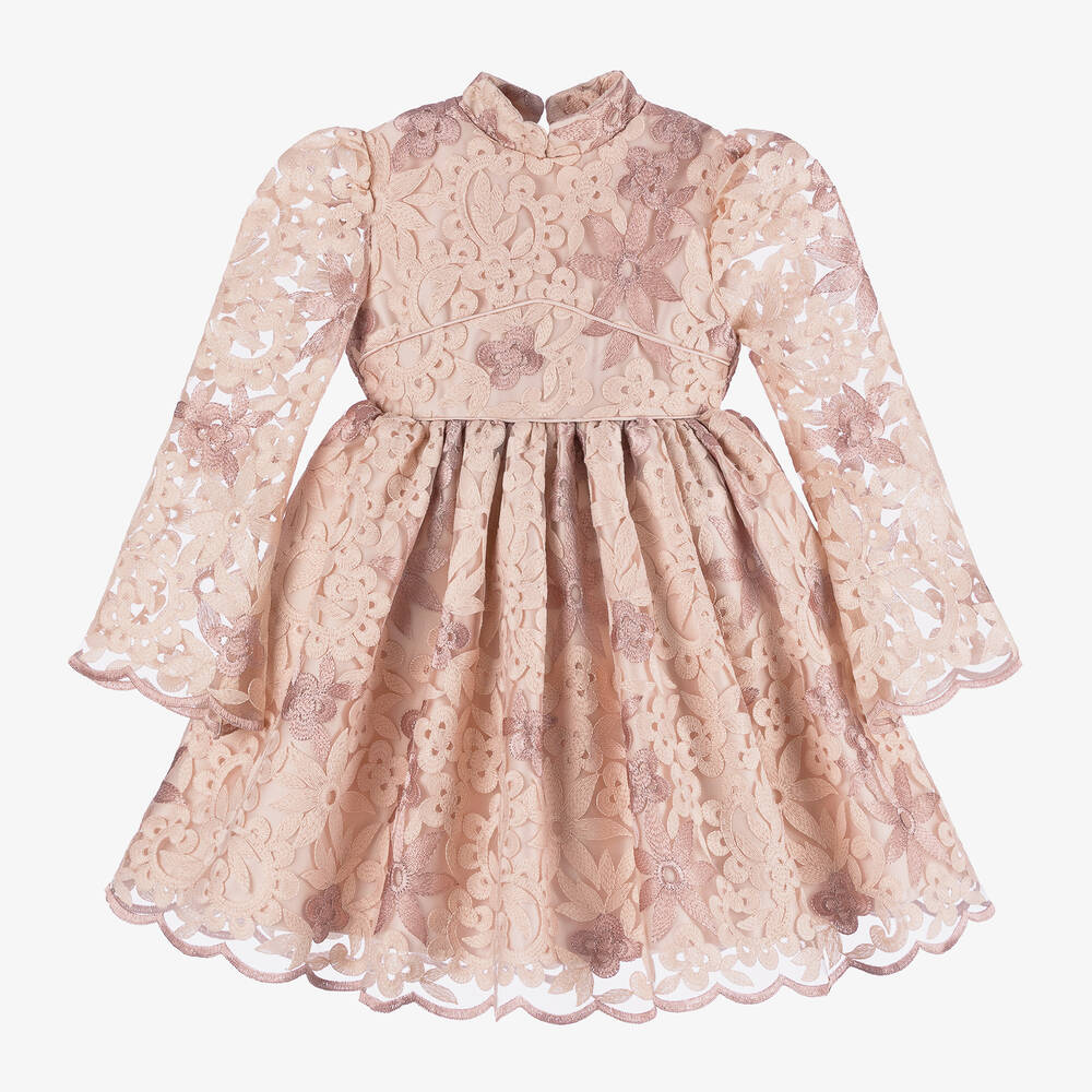 A blush pink dress for girls by Irpa, lovely for special occasions. Made from lightweight tulle, it is embroidered with a delightful floral pattern and has a silky satin underlayer. Lined in a smooth cotton-blended weave, there is an additional tulle panel for enhanced volume in the skirt. The sweetly scalloped hemline matches the cuffs of the sheer puffed long-sleeves. Fastening with a concealed zip on the back, it has a high neckline and tonal piping on the bodice for a neat finish.