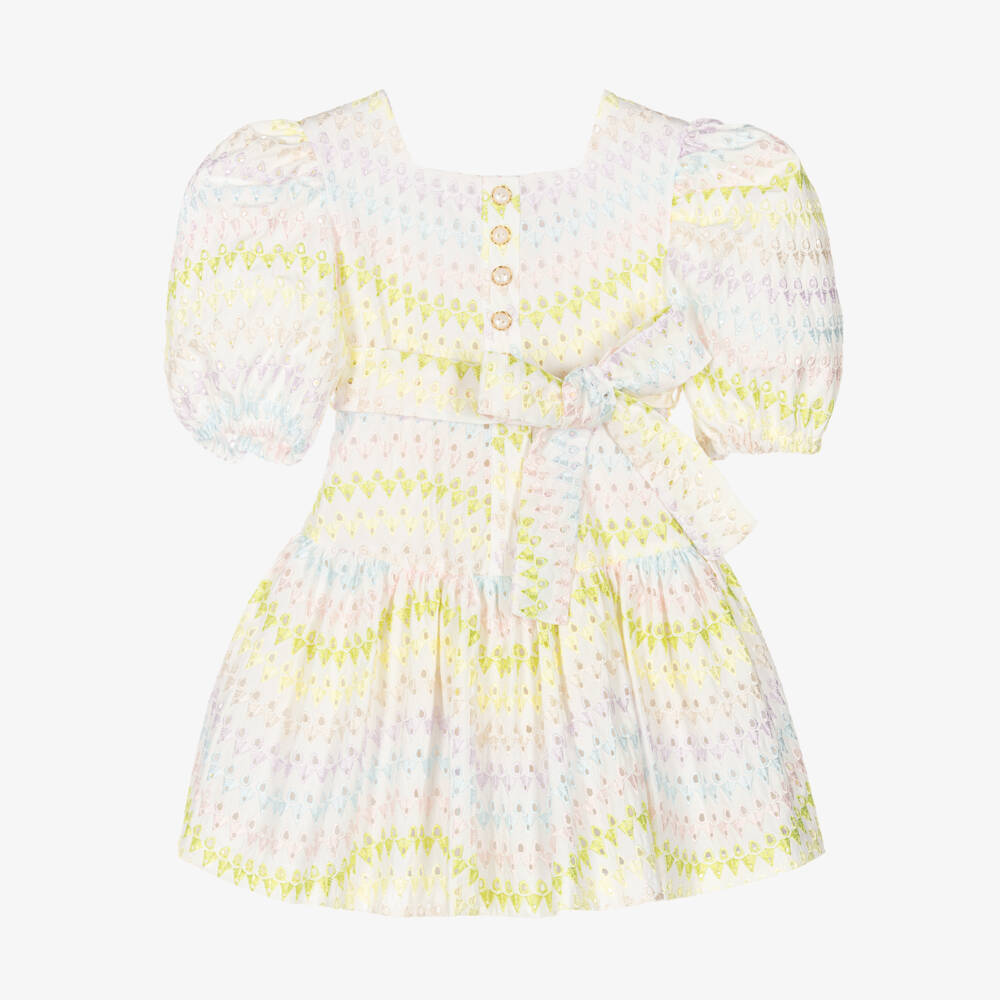 A beautiful white broderie anglaise dress for girls by Irpa, made from soft cotton. Sweet and pretty, the embroidered pattern is in a delightful pastel colour palette. For a feminine look, it has a square neckline, statement puffed sleeves, gold and pearlescent button embellishments, and a detachable sash belt that ties in a bow around the waist. Lined in smooth cotton, the dropped-waist skirt has an added tulle layer for extra volume, and there is a concealed back zip fastening for a neat finish.