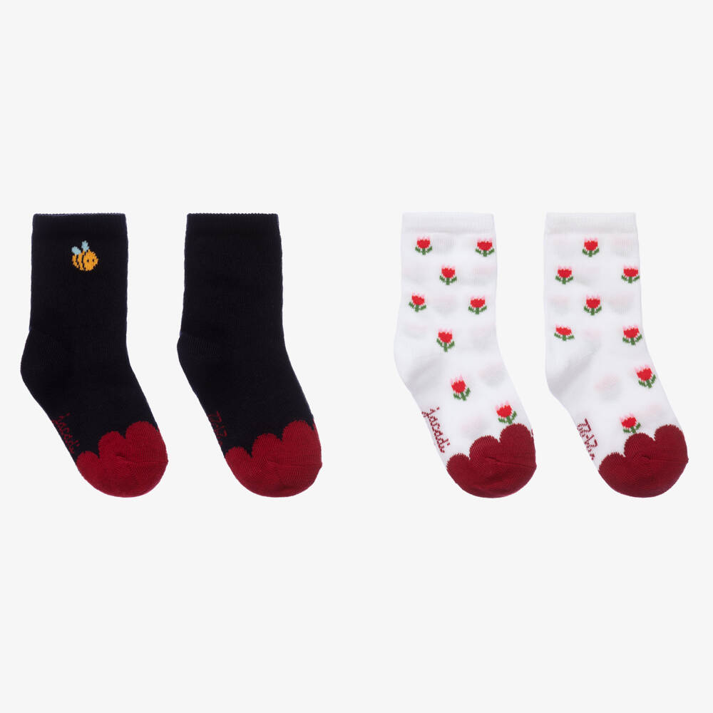 Two pairs of cotton-rich socks for baby girls from Jacadi Paris. Soft and gentle on delicate skin, one pair is white with a a sweet red and green floral pattern and the other pair is navy blue with cute bees on the ankle. An ideal gift, they come with a sweet drawstring poplin pouch that is hand-embroidered with 'My first socks' in French, accompanied by a bee and flower motif.