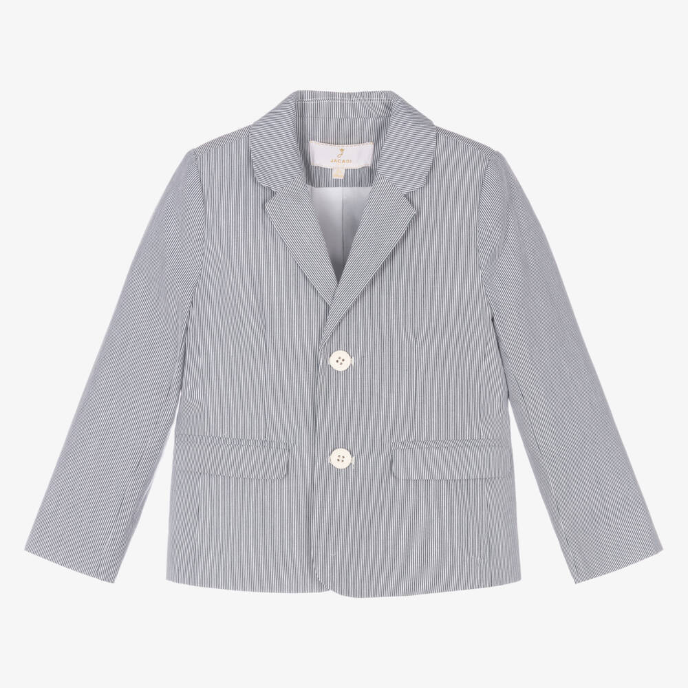 Combining comfort and elegance, this smart blazer for boys from Jacadi Paris is finely striped in navy blue and white. Beautifully tailored and in soft woven cotton with a lightweight lining, it has a single back vent for ease of movement. Slightly fitted, the jacket has branded button fastenings and front flap pockets. Decorative button detail on the cuffs completes the stylish look.